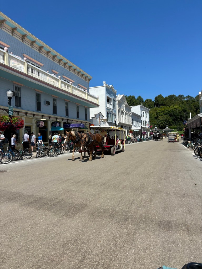 Mackinac Island boasts two old forts, originally built by the British and later taken over by the Americans in the 1800s. The charming old buildings, well-tended gardens, and absence of traffic gave the island a unique and peaceful vibe. We marveled at the hotel workers who somehow managed to balance huge piles of luggage on single bikes. After a day of walking and horse-watching, we treated ourselves to fish and chips, ice cream, fudge, and a bit of classic seaside (or lakeside in this case) shopping.