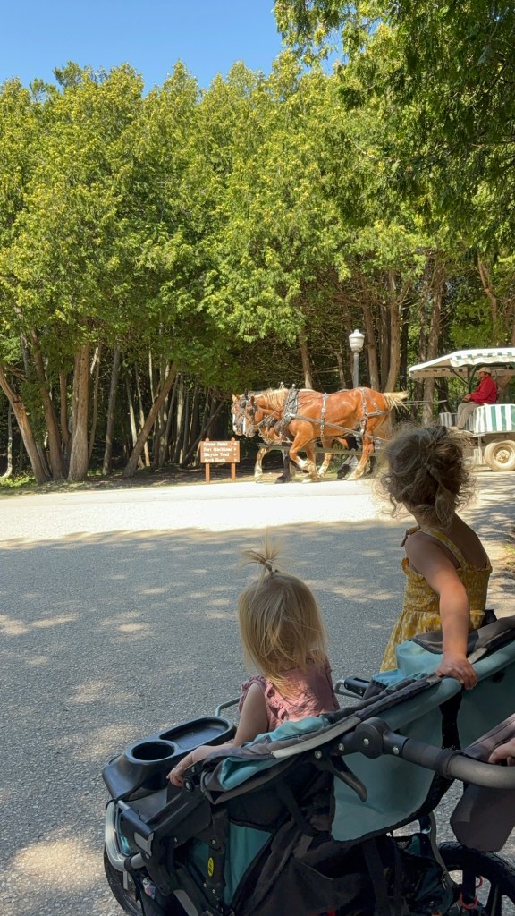 The highlight of the week was our ferry trip to Mackinac Island. This historic island, accessible only by boat, has no cars—just horses and bicycles. The girls loved the fast boat ride, and we all enjoyed exploring the island’s trails. Alice and Will bravely pushed the stroller, loaded with supplies, Maggie, and Tilly, up some pretty impressive inclines and worked together to hold on tightly on the declines.