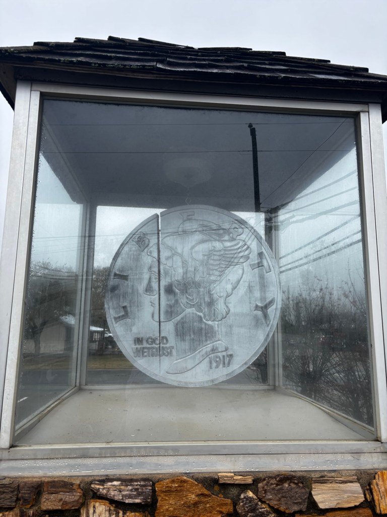 Now, with that in mind, our final drive day was predicted at 4.5 hours—longer than we prefer. Driving through eastern Texas, which (to put it nicely) doesn’t have much going on, we braced ourselves for a long haul. We started early and planned a halfway stop at a quirky roadside attraction: the World’s Largest Dime.